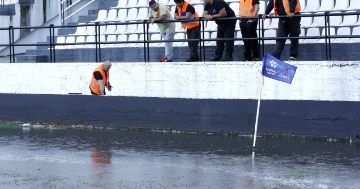 Σε «λίμνη» μετατράπηκε ο αγωνιστικός χώρος του γηπέδου της Δράμας, γεγονός που ανάγκασε τον διαιτητή της αναμέτρησης κ. Φωτιάδη να μην ξεκινήσει το ματς.