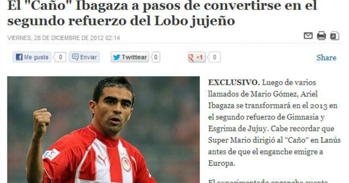 «Έπειτα από πολλές κλήσεις του Μάριο Γκόμες, ο Αριέλ Ιμπαγάσα μπορεί να γίνει το 2013 η δεύτερη μεταγραφή της Χιμνάσια και Εσκρίμα του Χουχούι. Θα υπενθυμίσουμε ότι ο Σούπερ Μάριο καθοδήγησε τον "κάνιο" στη Λανούς, πριν μετακομίσει στην Ευρώπη. Ο έμπειρος μέσος μετράει 36 χρόνια ζωής και διαθέτει μια τεράστια καριέρα στη Γηραιά Ήπειρο, αγωνιζόμενος σε ομάδες όπως η Ατλέτικο Μαδρίτης και η Βιγιαρεάλ. Τελευταία του ομάδα είναι ο Ολυμπιακός στην Ελλάδα, όπου κέρδισε το πρωτάθλημα».