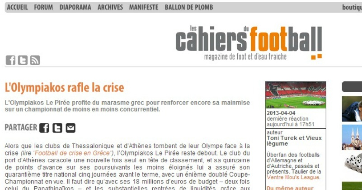 Το Cahiersdufootball, ένα γαλλικό ποδοσφαιρικό περιοδικό, τονίζει σε άρθρο του ότι το μεγάλο αβαντάζ του Ολυμπιακού είναι πως την ώρα που όλοι οι άλλες αποδυναμώνονται και το πρωτάθλημά μας γίνεται λιγότερο ανταγωνιστικό εκείνος γίνεται όλο και πιο δυνατός. «Όταν οι άλλοι σύλλογοι αδυνατούν να ανταποκριθούν στην κρίση, ο Ολυμπιακός παραμένει σταθερός και δυνατός.