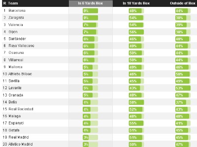 Τέλος, οι παίκτες της Μάλαγα έκαναν 11 σουτ στην εστία του Κουρτουά, όμως το 55% από αυτά ήταν εκτός περιοχής. Σε όλα τα υπόλοιπα παιχνίδια οι αντίπαλοι δεν μπόρεσαν να κάνουν περισσότερα από 10 σουτ. Αυτές οι επιδόσεις έχουν φέρει την Ατλέτικο στην πρώτη θέση της σχετικής λίστας, καθώς μόλις το 3% των σουτ που δέχονται έχουν γίνει μέσα από την μικρή περιοχή, ενώ το 50% από την μεγάλη περιοχή, αριθμοί που αναμένεται να βελτιωθούν και άλλο στη συνέχεια!