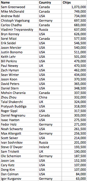 Συνολικά 39 παίκτες κατάφεραν να περάσουν στην επόμενη φάση του τουρνουά, την δεύτερη ημέρα, με κορυφαίο τον Sam Greenwood που έφτασε το 1 εκατομμύριο μάρκες. Στην δεύτερη θέση βρίσκεται ένας ακόμα Καναδός, ο Mike McDonald, ο οποίος έχει 749.000. Ο Daniel Negreanu (φωτ.) πέρασε στην Day 2 με 303.000 μάρκες.