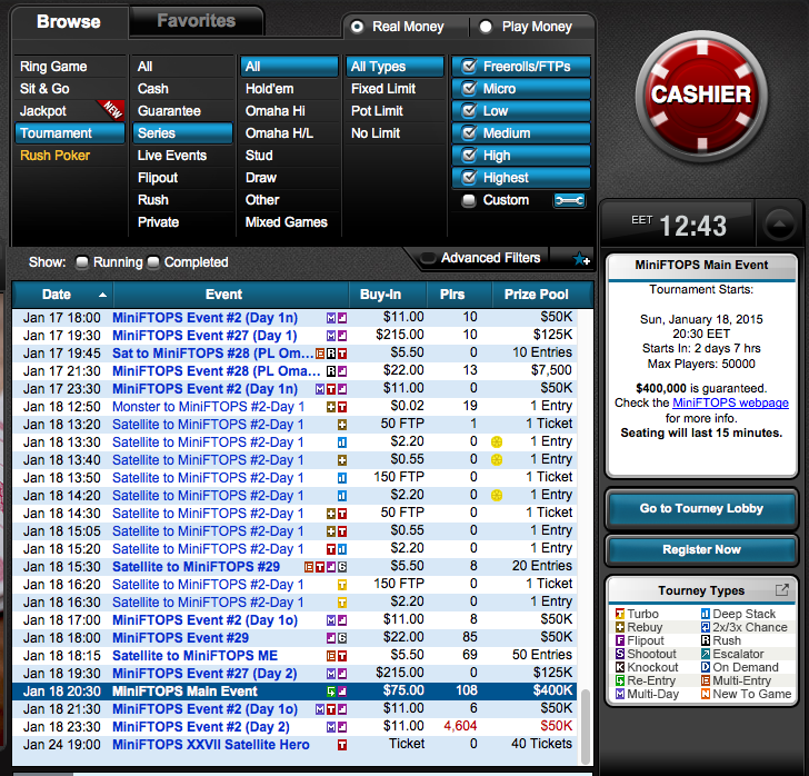 Επειδή το κόστος για να λάβετε μέρος μπορεί να είναι αρκετά μεγάλο για εσάς το Full Tilt σας δίνει την ευκαιρία να προκριθείτει με ελάχιστα δολάρια μέσα από τα προκριματικά που διοργανώνει. Τα τουρνουά της σειράς mini FTOPS θα τα βρείτε στην πλατφόρμα του Full Tilt κάνοντας κλικ στις κατηγορίες “Tournament” —> “Series” —> “All”. Βασική προυπόθεση είναι να έχετε ρυθμίσει την ώρα σε ελληνική (EET time) ώστε να ξέρετε σε ώρες Ελλάδος πότε ξεκινούν τα τουρνουά.