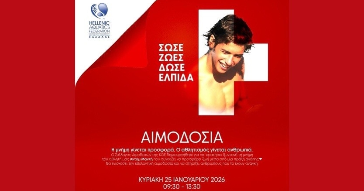 Ο Σύλλογος Αιμοδοτών της Κολυμβητικής Ομοσπονδίας Ελλάδας, δημιουργήθηκε για να κρατήσει ζωντανή τη μνήμη του και στο πλαίσιο αυτό η ΚΟΕ διοργανώνει αιμοδοσία για την Κυριακή 25 Ιανουαρίου 2026 και ώρες 09.30-13.30.