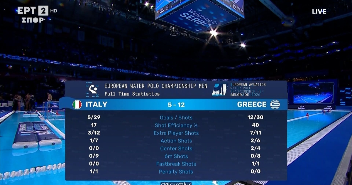 Η Εθνική ομάδα «έπνιξε» στις δαγκάνες της την Ιταλία, επικράτησε με 12-5 κατακτώντας το χάλκινο μετάλλιο στο ευρωπαϊκό πρωτάθλημα του Βελιγραδίου, το πρώτο της στην ιστορία της διοργάνωσης.
