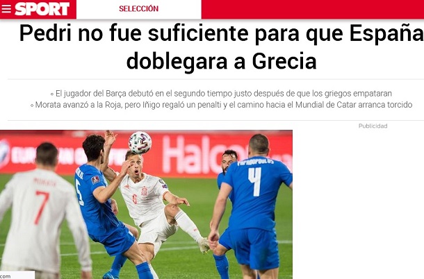 Sport: «Ο Πέδρι δεν ήταν αρκετός ώστε η Ισπανία να λυγίσει την Ελλάδα. Ο Ίνιγο χάρισε ένα πέναλτι και ο δρόμος για το Μουντιάλ ξεκίνησε στραβά»