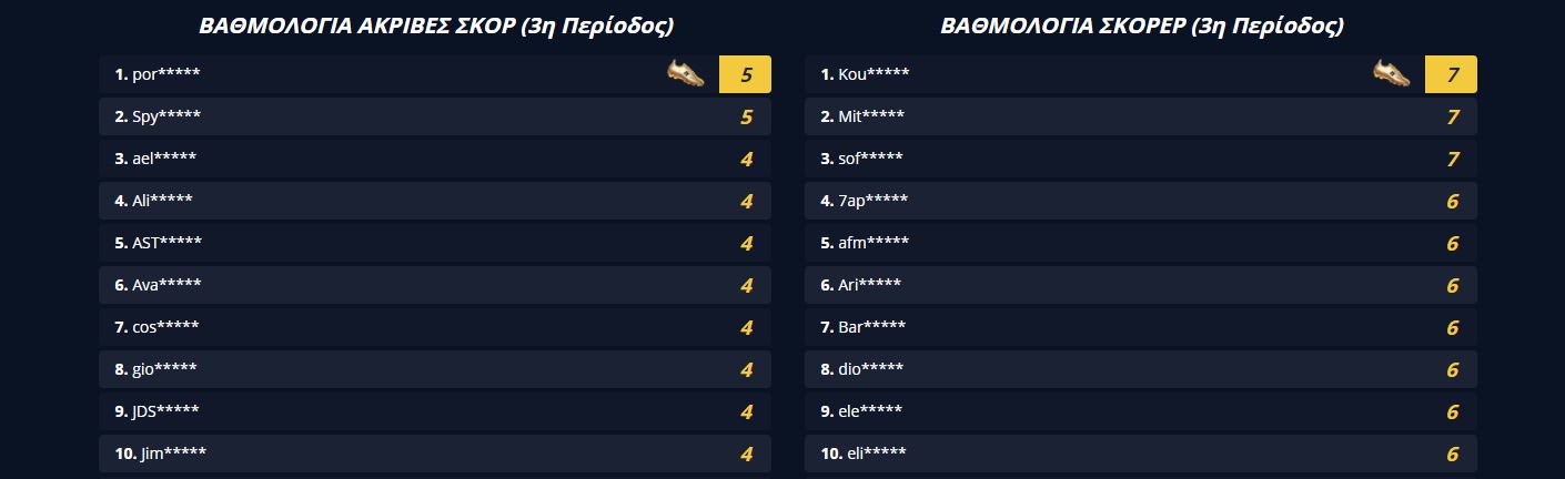 Πάμε και στις βαθμολογίες τώρα. Στον πίνακα των ακριβές σκορ υπάρχουν 2 που έχουν βρει από πέντε ακριβές σκορ. Στους σκόρερ αντίθετα υπάρχουν τρία άτομα με 7 σωστές προβλέψεις.