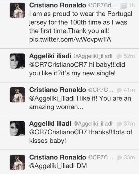 Λίγες μέρες μετά τη συμπλήρωση 100 συμμετοχών με τη φανέλα της Εθνικής Πορτογαλίας, ο Κριστιάνο Ρονάλντο, θα μπορούσε να το έχει γιορτάσει με έναν διάλογο στο twitter με την Αγγελική Ηλιάδη. Γιατί όχι; Ετσι τουλάχιστον πίστεψε η ίδια. Η Ελληνίδα τραγουδίστρια πάτησε το όνομα του CR7 στο twitter και μπήκε στο πρώτο αποτέλεσμα που της έβγαλε χωρίς να μπει στον κόπο να το ψάξει.