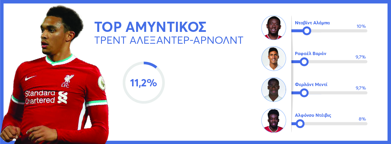 Μεγάλη μάχη σε ότι έχει να κάνει με τους αμυντικούς. Τελικά με μικρή διαφορά ο Τρεντ Αλεξάντερ-Αρνολντ αναδείχθηκε ως ο κορυφαίος σύμφωνα πάντα με τις ψήφους σας. Ο Αγγλος δεξιός μπακ της Λίβερπουλ άφησε πίσω του και τον Νταβίντ Αλάμπα της Μπάγερν Μονάχου (11,2% έναντι 10%) αλλά και τον Ραφαέλ Βαράν της Ρεάλ Μαδρίτης (9,7%). Ίδιο ποσοστό και για τον Φερλάντ Μεντί, ο οποίος με το υπέροχο γκολ που σημείωσε χάρισε τη νίκη στην «Βασίλισσα» μέσα στην Αταλάντα. Στην πέμπτη θέση ο Αλφόντο Ντέιβις της Μπάγερν.