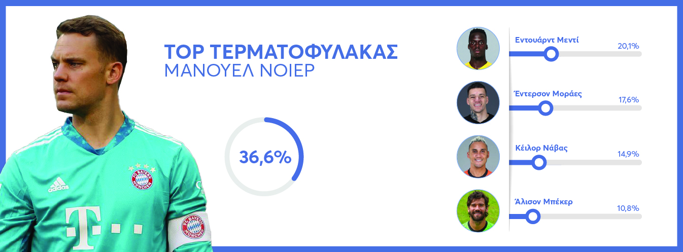 Με μεγάλη διαφορά ο Μάνουελ Νόιερ ψηφίστηκε από εσάς ως ο καλύτερος τερματοφύλακας για τους πρώτους αγώνες στην φάση των «16». Ο Γερμανός συγκέντρωσε το 36,6% των ψήφων αφήνοντας στην δεύτερη θέση τον Έντουαρντ Μεντί της Τσέλσι ο οποίος είχε κρατήσει το μηδέν μέσα στην έδρα της Ατλέτικο Μαδρίτης. Στην τρίτη θέση ο Έντερσον της Σίτι με το 17,6% των ψήφων με τους Νάβας και Αλισον να κλείνουν την πεντάδα.