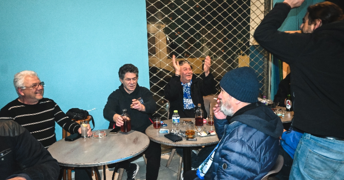Είναι περίπου 3 το μεσημέρι και το τσιπουράδικο είναι γεμάτο. Το ίδιο και τα τραπέζια. Τσίπουρα -με γλυκάνισο ή χωρίς- και αμέτρητα πιάτα με μεζέδες. Καλαμαράκια, γυαλιστερές, γαρίδες και κάθε λογής θαλασσινά. Το κύριο θέμα συζήτησης όλων είναι το παιχνίδι.