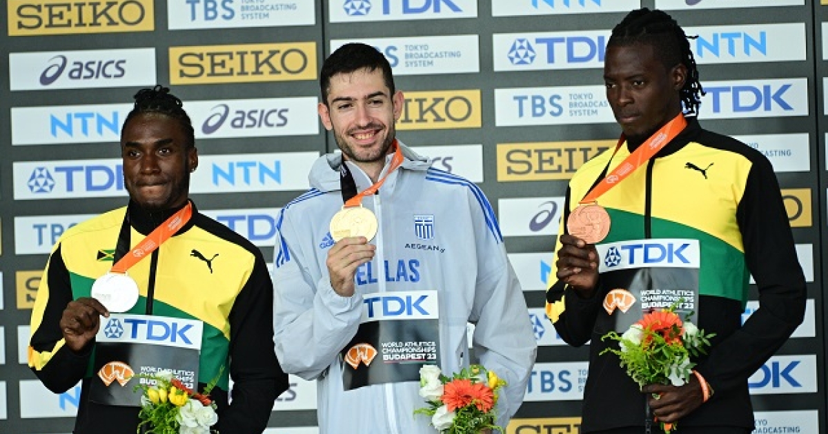 Ο «χρυσός» Μίλτος Τεντόγλου και οι Τζαμαϊκανοί, Γουέινι Πίνοκ και Τάτζαϊ Γκέιλ ανέβηκαν στο βάθρο του μήκους στο παγκόσμιο πρωτάθλημα, σε μια από τις πιο σημαντικές στιγμές της καριέρας του.