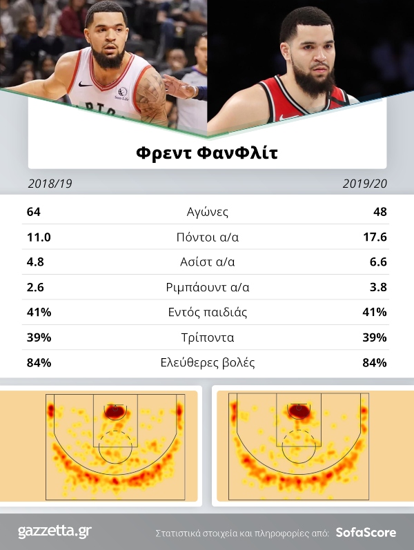 Πάμε και στον ΦανΦλίτ, ένα από τα... κλειδιά του περσινού πρωταθλήματος. Από τότε που γεννήθηκε ο γιος του, ο Φρεντ άρχισε να τα στάζει δίχως έλεος, κάνοντας τον Νερς ευτυχισμένο. Ο αθεόφοβος μέτρησε 14/17 τρίποντα και 16 πόντους μέσο όρο στα τελευταία 3 ματς με τους Μπακς, ενώ πριν έρθει στον κόσμο ο γιος του είχε 8/41 τρίποντα και 4 πόντους μέσο όρο! Φέτος δίνει σημαντικές βοήθειες στον Κάιλ Λάουρι, έχοντας σημείωσε άνοδο σε όλα τα νούμερα του. Από τους 11 πόντους μέσο όρο στην περσινή regular season, έχει εκτοξευτεί στους 17.6! Φυσικά είναι βελτιωμένος σε ριμπάουντ και ασίστ, ενώ εκεί που κάνει θραύση, είναι στα κλεψίματα (1.9 ανά ματς). Ο Φρεντ φυσικά είναι μετρ του τριπόντου και όπως βλέπουμε από το γράφημα του sofascore, σκοράρει από παντού έξω από τη γραμμή του τριπόντου, ενώ απειλεί και με τις διεισδύσεις του φτάνοντας μέχρι το καλάθι.