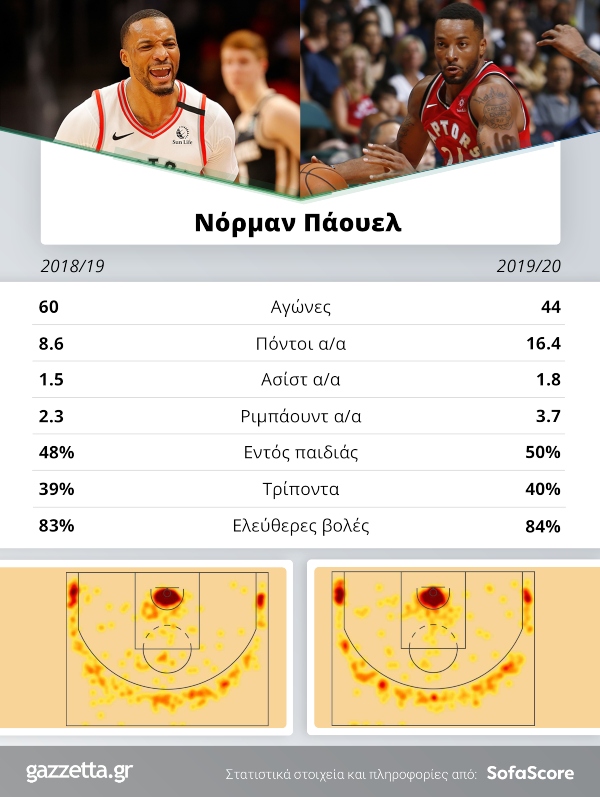 Τρίτος της παρέας που κάνει θαύματα είναι ο Νόρμαν Πάουελ, ο οποίος ήταν σημαντικό γρανάζι του Νερς και στην σειρά με τους Μπακς πέρυσι, όπου οι Καναδοί επέστρεψαν από το 0-2, το έκαναν 4-2 και πήραν μια τεράστια πρόκριση. Ο Νόρμαν έχει διπλασιάσει σχεδόν τον μέσο όρο σε πόντους σε σχέση με πέρυσι. Από το 8.5 έχει σκαρφαλώσει στο φετινό 16.4, όντας κύριος πόλος της επίθεσης των πρωταθλητών. Δεν είναι λίγο να έχεις 16.4 πόντους σε μια ομάδα με Σιάκαμ, Λάουρι, ΦανΦλίτ, Γκασόλ και Ιμπάκα.