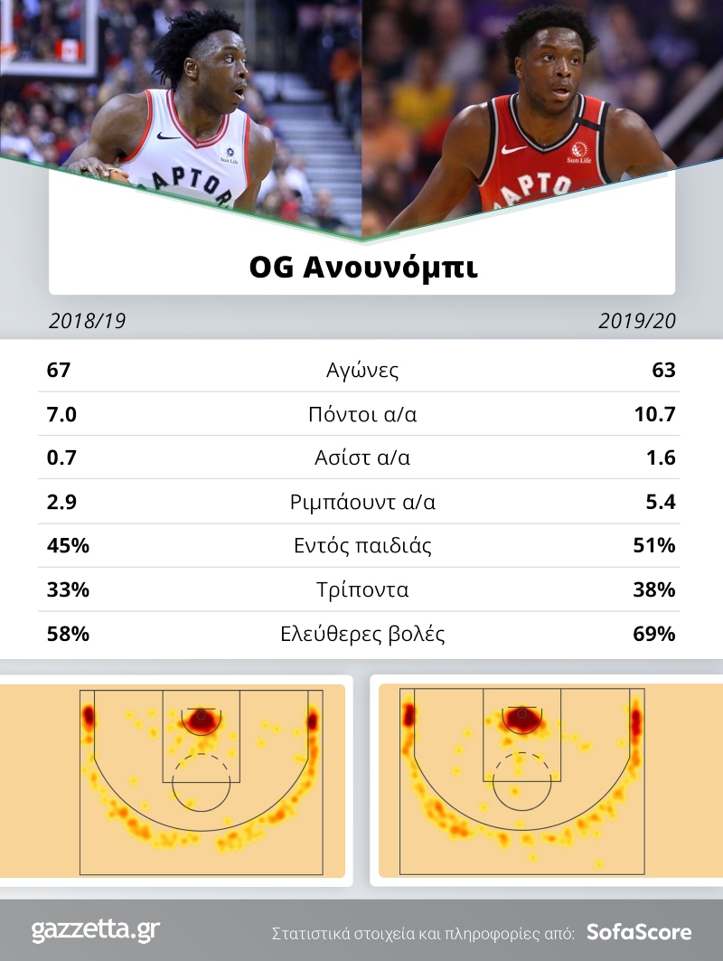 Και κλείνουμε την μαγική τετράδα με έναν παίκτη που πέρυσι, είχε την μικρότερη συνεισφορά. Τον OG Aνουνόμπι που πέρασε μια περίεργη σεζόν, έχοντας 7 πόντους, 2.9 ριμπάουντ και 0.7 ασίστ. Φέτος είναι παραπάνω σε όλα, ενώ έχει ξεκινήσει βασικός σε 62 ματς, τη στιγμή που την αγωνίστηκε περίοδο 2018/19 το έπραξε μόλις σε 6. Από το... πουθενά βρέθηκε στην πεντάδα και δίνει σημαντικές λύσεις στον Νικ Νερς σε άμυνα και επίθεση. Έχει ταιριάξει εξαιρετικά και με τους υπόλοιπους βασικούς (Λάουρι, ΦανΦλιτ, Σιάκαμ, Γκασόλ). Στο infographic του sofascore που ακολουθεί βλέπουμε πως και ο Ανουνόμπι είναι λάτρης των 2 γωνιών του γηπέδου, αφού εκτελεί τα τρίποντα του, ενώ η σωματοδομή του τον βοηθά να αποτελεί σημείο αναφοράς και στο... ζωγραφιστό.