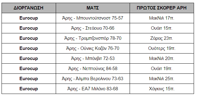 Μάλιστα, ο Άρης έχει καταφέρει να πανηγυρίσει και στο μοναδικό ματς που έδωσε στο… σπίτι του και για τον Κύπελλο, όταν στις 7 Οκτωβρίου του 2015 υπέταξε την ΑΕΚ με 64-61!