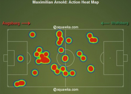 *Στο γράφημα ο χώρος που κινήθηκε ο Άρνολντ στην εκτός έδρας νίκη 2-1 της Βόλφσμπουργκ επί της Άουγκσμπουργκ (πηγή Squawka)