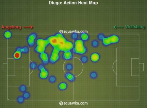 *Στο γράφημα ο χώρος που κινήθηκε ο Ντιέγκο στην εκτός έδρας νίκη 2-1 της Βόλφσμπουργκ επί της Άουγκσμπουργκ (πηγή Squawka)