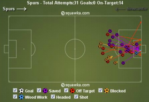 *Στο γράφημα οι τελικές προσπάθειες της Τότεναμ στην ήττα 1-0 από τη Νιούκαστλ (πηγή Squawka)