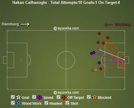 *Στο γράφημα τα σουτ του Τσαλχάνογλου στη νίκη 2-1 επί της Νυρεμβέργης (πηγή Squawka)