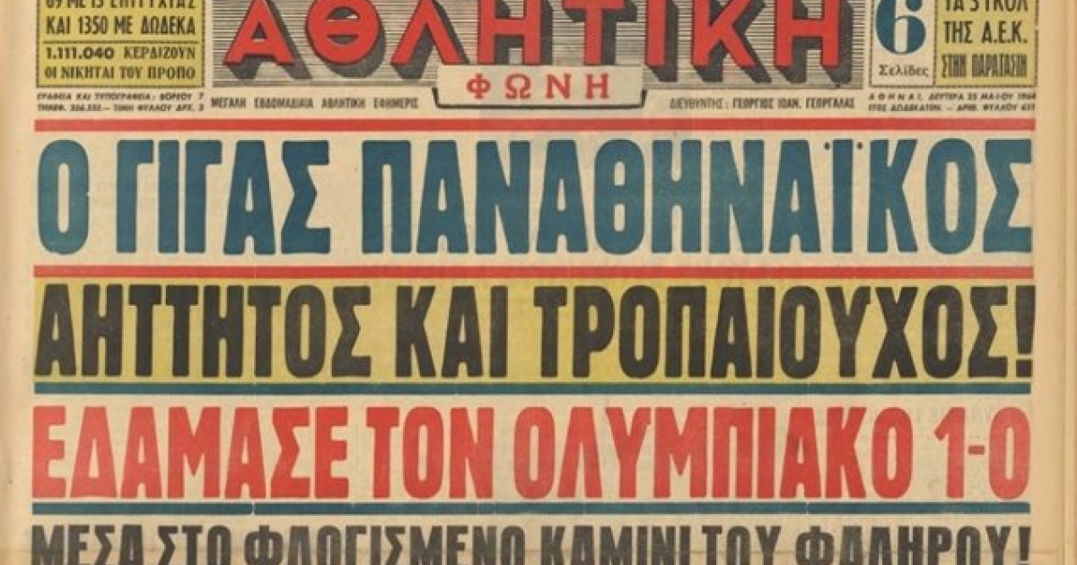 «O γίγας Παναθηναϊκός αήττητος και τροπαιούχος! Εδάμασε τον Ολυμπιακό 1-0 μέσα στο φλογισμένο καμίνι του Φαλήρου! Το γκολ επέτυχε ο Πανάκης με κεφαλιά. -Οι Ολυμπιακοί το ημφεσβήτησαν αλλά ο Γερμανός διαιτητής πεισθείς από τη γνώμην του συμπατριώτου του επόπτου το κατεκύρωσε. -Η ιστορική μάχη έκλεισε με τον γύρο του θριάμβου και με την παρέλασιν των πρωταθλητών προς Αθήνας. 30 αγώνες: 24 νίκες, 6 ισοπαλίες, νέο ρεκόρ βαθμών 84», αναφέρει η εφημερίδα, την οποία μας διέθεσε τοΑρχείο Τύπου Εφημερίδων και Περιοδικών, στο πρωτοσέλιδό της.