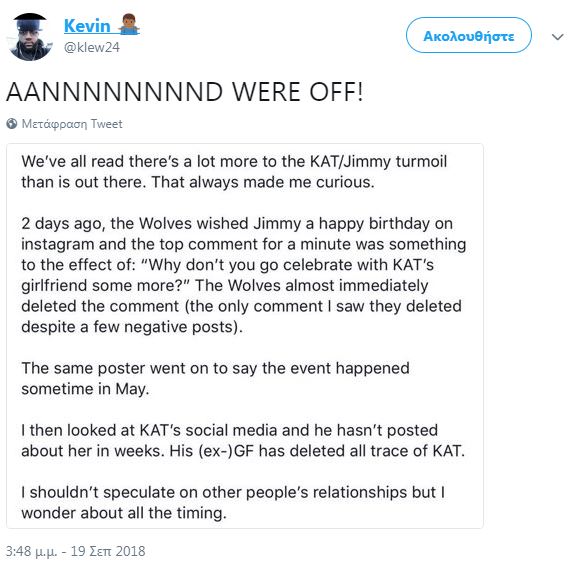 Επίσης, οι Τίμπεργουλβς είχαν κάνει μια ανάρτηση για τα γενέθλια του Μπάτλερ και κάποιος σχολίασε: «Γιατί δεν πας να το διασκεδάσεις λίγο ακόμα με την κοπέλα του Τάουνς;». Ήταν το ΜΟΝΟ σχόλιο, μεταξύ άλλων αρνητικών, που διέγραψε η ομάδα της Μινεσότα και μάλιστα, αμέσως.