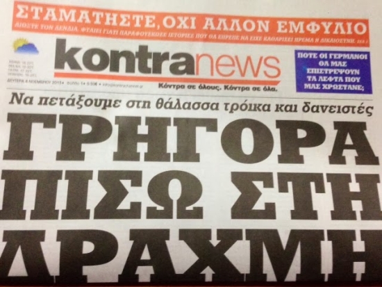 Διάβασα… το νέο πρωτοσέλιδο της «Kontra News» που κρεμάστηκε σήμερα στα περίπτερα για πρώτη φορά. Με τίτλο «Γρήγορα πίσω στη δραχμή».