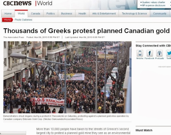 Aυτή η πορεία δεν «χώρεσε» σε κανένα ΜΜΕ… Πλην της ET3, η οποία ήταν η μόνη τηλεόραση που έδειξε πλάνα από τη μεγαλειώδη πορεία 15.000 ανθρώπων στη Θεσσαλονίκη για τις Σκουριές. Από τα ξένα μέσα, το γαλλικό πρακτορείο AFP «είδε» 5.000 διαδηλωτές ενώ για «πάνω από 10.000 διαδηλωτές» μίλησε το καναδικό δίκτυο CBC.