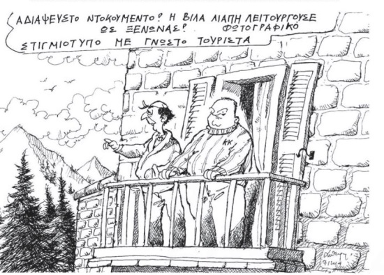 Κι όμως, η βίλα του Μιχάλη Λιάπη που έγινε διάσημη λόγω των τουριστικών επιδοτήσεων, λειτούργησε ως ξενώνας με έναν διάσημο τουρίστα: τον Κώστα Καραμανλή! Σύμφωνα πάντα με το σκίτσο του Ανδρέα Πετρουλάκη στην «Καθημερινή».