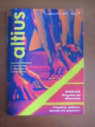 Ονομάζεται «αltius» και είναι το αποτέλεσμα μιας ομάδας «αθεράπευτα τολμηρών και γραφιάδων» (μεταξύ αυτών ο Γιάννης Μαμουζέλος) από το χώρο του αθλητισμού και της φυσικής αγωγής που προχώρησε στην έκδοση του εν λόγω τριμηνιαίου περιοδικού. Στο πρώτο τεύχος (με 64 σελίδες) παρουσιάζονται οι διαστάσεις της πρακτικής εφαρμογής των μνημονιακών πολιτικών στο χώρο του αθλητισμού κι αποκαλύπτεται ειδικότερα τι συνέβη στην περίπτωση της κολύμβησης σε ειδικό φάκελο αλλά πώς προέκυψε η Ολυμπιακή Λαμπαδηδρομία το 1936, μια “θαυμάσια” ιδέα του Δρος Γκέμπελς. Κεντρική διάθεση του περιοδικού από τις εκδόσεις «Νήσος», Σαρρή 14 στην Αθήνα.