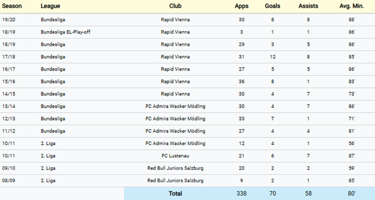Με την ομάδα της αυστριακής πρωτεύουσας έφτασε τις 241 συμμετοχές (51 γκολ, 51 ασίστ), με γεμάτες χρονιάς, χαρακτηριστικό παράδειγμα τα νούμερα που κατέγραψε την τελευταία τετραετία: 155 αγώνες, 37 γκολ και 38 ασίστ.
