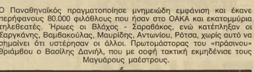 «Ο Σαραβάκος και ο Αντωνίου μεγαλούργησαν, ιδιαίτερα στην επανάληψη», ανέφερε χαρακτηριστικά η Αθλητική Ηχώ και ανήμερα του αγώνα στεκόταν σε μια άλλη, μεγάλη ανατροπή που είχε κάνει ο Παναθηναϊκός. Αυτή με τον Ερυθρό Αστέρα στη μεγάλη πορεία για το Γουέμπλεϊ. «Η ψυχή του Γουέμπλεϊ θα δώσει φτερά στους παίκτες με το τριφύλλι στο στήθος και όλοι πιστεύουν πως θα τους οδηγήσει σ' ένα ιστορικό θρίαμβο όπως τότε το 1971, που η ταξιαρχία του Δομάζου ανέτρεψε το 4-1 του Ερυθρού Αστέρα με ένα εκπληκτικό 3-0», έγραφε!