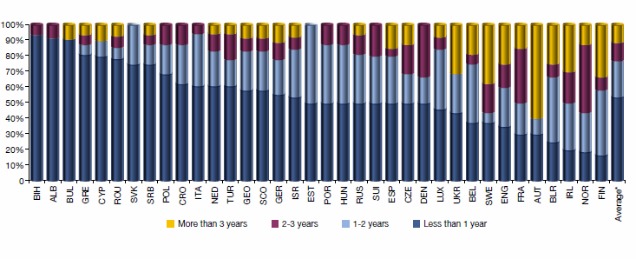Κατά μέσο όρο οι προπονητές κάθονται για 1,5 χρόνο στους πάγκους των ομάδων τους, όμως από αυτούς που έχουν συμβόλαιο αυτή τη στιγμή μόλις το 12% το έχει υπογράψει πριν από 3 ή περισσότερα χρόνια! Οι αυστριακές ομάδες αποδεικνύονται οι πιο σταθερές στην επιλογή προπονητών, καθώς το 60% μένει στον πάγκο για περισσότερο από 3 χρόνια. Στον αντίποδα, το ποσοστό της Βοσνίας, της Αλβανίας και της Βουλγαρίας για τους τεχνικούς που μένουν για παραπάνω από 1 χρόνο στον πάγκο είναι λιγότερο από 10%, με τις ελληνικές ομάδες να ακολουθούν στην 4η θέση! Πιο συγκεκριμένα, το 80% των προπονητών δεν αντέχουν στον πάγκο για περισσότερο από 1 χρόνο, το 6% μένει από 1 έως 2 χρόνια, το 6% για 2 με 3 χρόνια και το υπόλοιπο 8% για περισσότερα από 3 χρόνια!