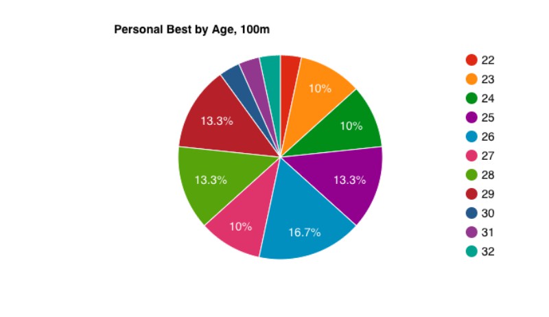 Με μια πιο προσεκτική ματιά στο γράφημα που ακολουθεί, γίνεται αντιληπτό το παραπάνω, αφού η πλειοψηφία των καλύτερων επιδόσεων στην αθλητική ζωή των σπρίντερ έρχονται μεταξύ των 23 και των 28 ετών. Από τα 24 ως τα 26 μάλιστα καταγράφονται τα σπουδαιότερα ρεκόρ σε σχέση με οποιαδήποτε άλλη τριετία.