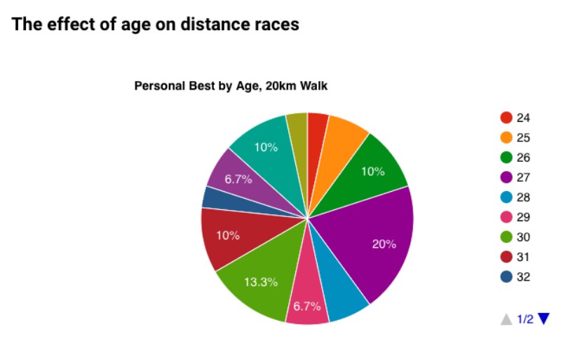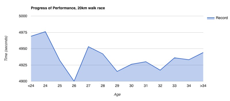 Όπως φαίνεται και στο γράφημα, η εικόνα δεν μοιάζει με αυτή που παρουσιάζουν οι σπρίντερ όσο μεγαλώνουν. Το peak των αθλητών του βάδην μεταφέρεται λίγα χρόνια μετά τα μέσα των 20s, προς το τέλος της τρίτης δεκαετίας της ζωής τους και στις αρχές της τέταρτης. Στη συγκεκριμένη περίπτωση πάντως, δεν μπορεί κάποιος να είναι κατηγορηματικός, σύμφωνα με τα στοιχεία του Statathlon, αφού με βάση τη μέθοδο του T-test, που χρησιμοποιείται ως επιβεβαίωση για την εγκυρότητα των στοιχείων, η περίπτωση αυτή μπορεί να θεωρηθεί επαρκής για συμπεράσματα, ωστόσο οι εξαιρέσεις δεν είναι τόσο λίγες, όσο στην περίπτωση των σπρίντερ.