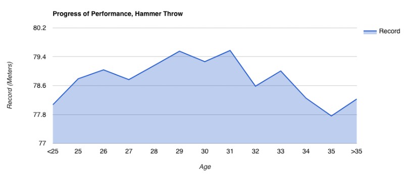 Η φυσική αντοχή/δύναμη συνήθως αγγίζει το maximum μεταξύ 25 και 30 ετών. Στη συνέχεια διατηρείται σταθερή έως τα 40 περίπου, όταν ξεκινά η μείωση. Αυτό εξηγεί γιατί οι περισσότεροι αθλητές με σφυρί χτύπησαν το καλύτερό τους ρεκόρ όταν πλησίασαν ή οριακά ξεπέρασαν τα 30, κάτι που φαίνεται και στο παραπάνω γράφημα.