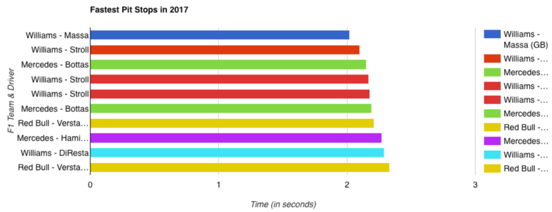 Όπως διαπιστώθηκε, ο χρόνος διακοπής στα pit stops είναι ιδιαίτερα κρίσιμος. Στο γράφημα που ακολουθεί παρουσιάζονται οι 10 κορυφαίοι χρόνοι της F1 για τη σεζόν 2015/16.