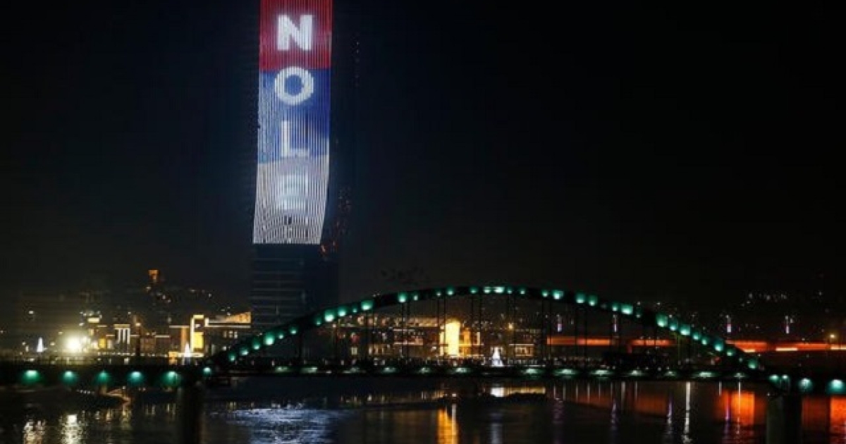 Ο πύργος του Βελιγραδίου από νωρίς την Κυριακή «ντύθηκε» με το όνομά του και συνθήματα. «Νόβακ είσαι το καμάρι της Σερβίας» και «Έλα σπίτι Νόλε, οι άνθρωποί σου σε αγαπούν» ήταν δύο χαρακτηριστικά μηνύματα.