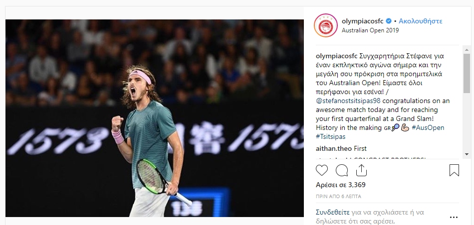 Ο Στέφανος Τσιτσιπάς γράφει ιστορία στη Μελβούρνη και ο Ολυμπιακός του έδωσε συγχαρητήρια μέσω του λογαριασμού του στο instagramm. «Είμαστε όλοι υπερήφανοι για εσένα», έγραψαν μεταξύ άλλων οι «ερυθρόλευκοι».