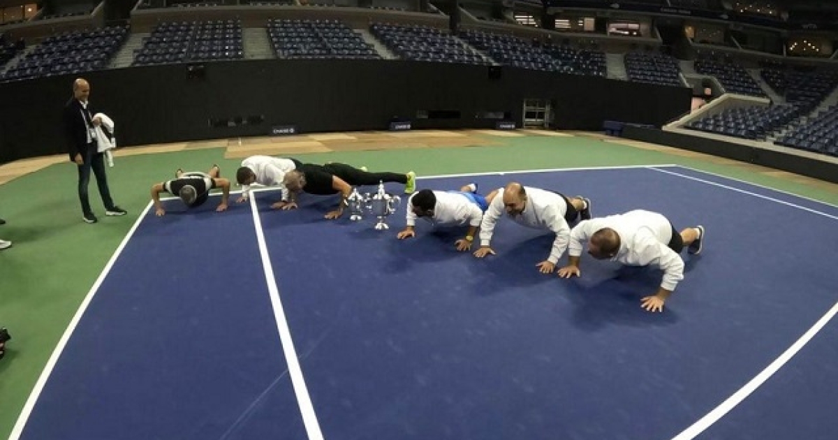 Όταν τα φώτα στο «Arthur Ashe» έσβησαν ο 36χρονος Τζόκοβιτς εμφανίστηκε στο άδειο από θεατές κεντρικό γήπεδο των εγκαταστάσεων με το βαρύτιμο τρόπαιο και συνοδευόμενος με την ομάδα του. Εκεί ο Τζόκοβιτς τους «υποχρέωσε» σε ένα καψόνι, να κάνουν όλοι μαζί 24 κάμψεις, μια για κάθε Grand Slam τίτλο που έχει κατακτήσει.