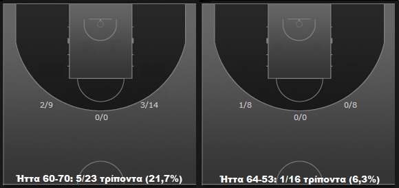 Έπειτα το 1-2 στα playoffs οι παίκτες του Αργύρη Πεδουλάκη έσπασαν τα καλάθια πίσω απ' τα 6,75μ., έχοντας συνολικά 6/39 προσπάθειες, ήτοι μόλις 15,4%.
