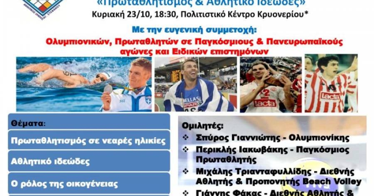 Η διάλεξη θα γίνει με τη συμμετοχή του Ολυμπιονική Κολύμβησης Σπ. Γιαννιώτη, του Παγκόσμιου Πρωταθλητή, Περικλή Ιακωβάκη, του Πανευρωπαϊκού πρωταθλητή πετοσφαίρισης- ομοσπονδιακού προπονητή Μιχάλη Τριανταφυλλίδη, του διεθνή παίκτη, ομοσπονδιακού προπονητή και τεχνικού διευθυντή του Α.Ο. Αγίου Στεφάνου, Γιάννη Φάκα και της επιστήμονος διατροφολόγου της εθνικής ομάδας στίβου, κ. Αφροδίτης Μέντζου.