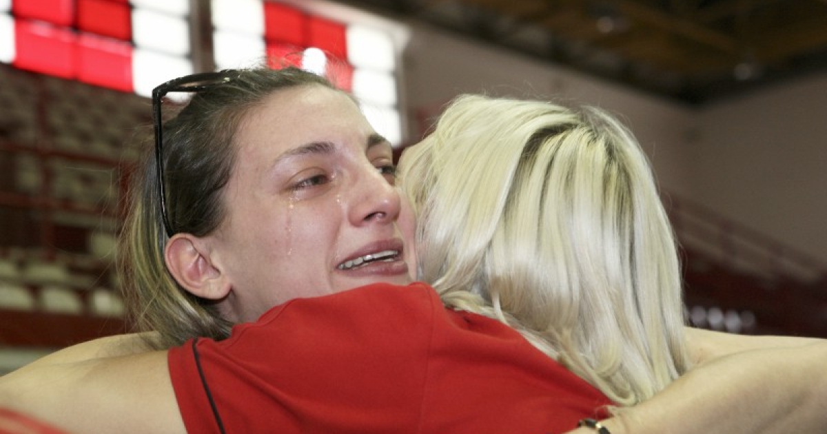 Η τραυματίας Μαρία Νομικού περίμενε τις αθλήτριες του βόλεϊ του Ολυμπιακού στον Ρέντη και ξέσπασε σε κλάματα από την συγκίνηση για το τρόπαιο, δίνοντας και συγχαρητήρια.