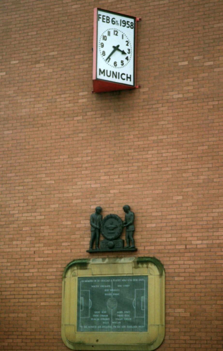Στην πρόσοψη του γηπέδου, υπάρχει φυσικά το σταματημένο ρολόι στις 03:04, για να θυμίζει σε όλους εκείνα τα «μωρά» του Μπάσμπι, που έχασαν τη ζωή τους την αποφράδα 6η Φεβρουαρίου του 1958, υπάρχει από το 1996 το άγαλμα του πρωτομάστορα εκείνης της ομάδας, που άφησε την τελευταία του πνοή τον Γενάρη του 1994.