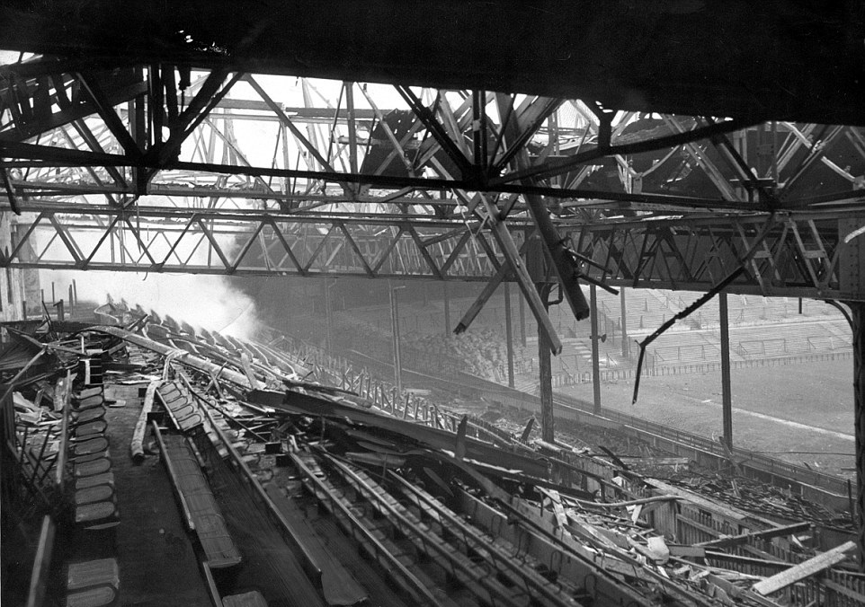 Μια από τις πιο δύσκολες περιόδους του γηπέδου, ήταν το 1941, στον Β' Παγκόσμιο Πόλεμο. Οι συνέπειες της χειρότερης ενέργειας της ανθρωπότητας, όταν ο ένας στρέφεται απέναντι στον άλλον συνάνθρωπό του, έγιναν εμφανείς και στο «Ολντ Τράφορντ», το οποίο και βομβαρδίστηκε, με αποτέλεσμα να προκληθούν σημαντικές φθορές στις εξέδρες, όπως θα δείτε στην παρακάτω φωτογραφία.