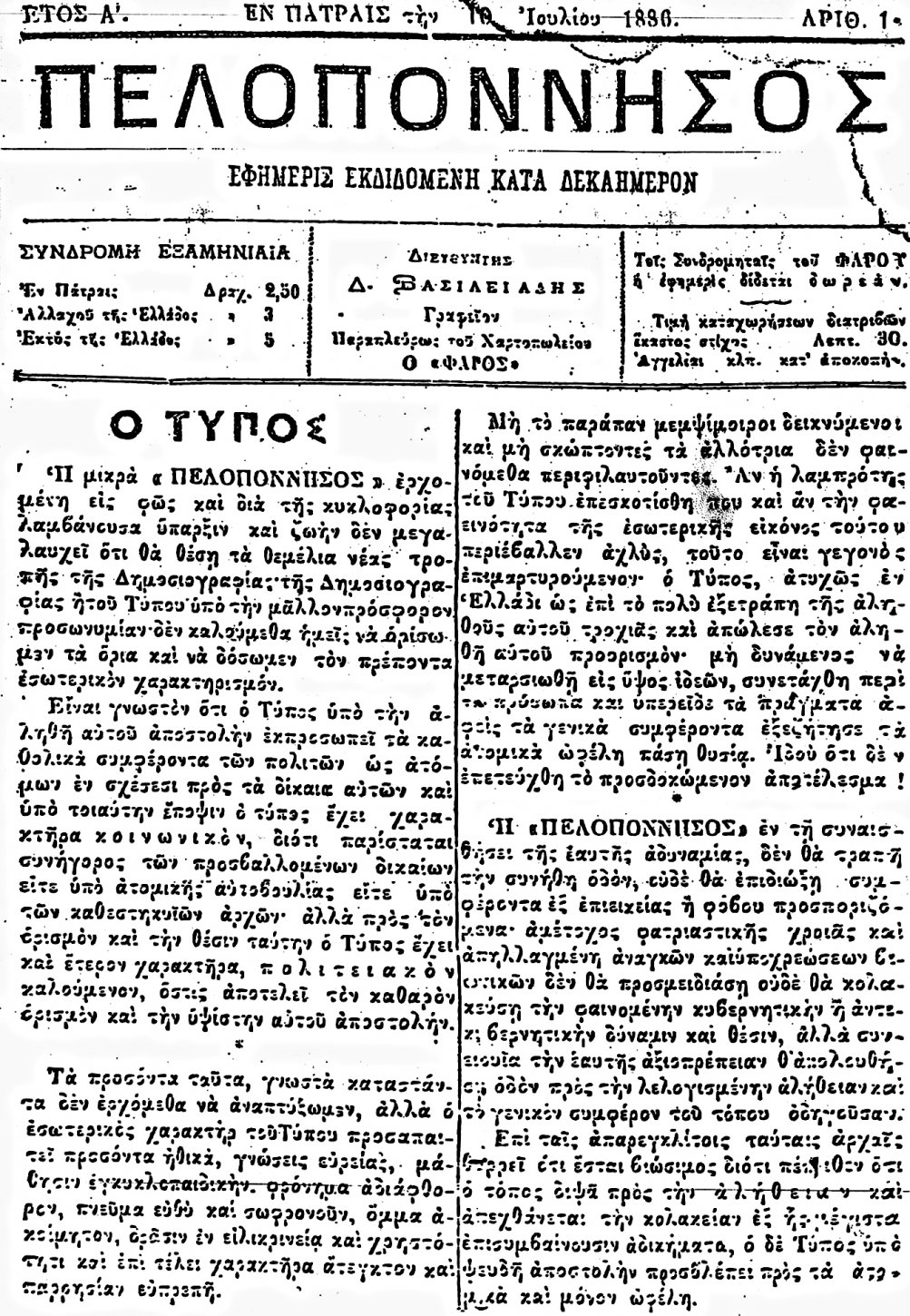 H «Πελοπόννησος» είναι η αρχαιότερη εφημερίδα που κυκλοφορεί ακόμα στην Ελλάδα και ξεκίνησε την πορεία της στις 10 Ιουλίου του 1886 ως δεκαήμερη έκδοση, όμως στην πορεία άλλαξαν πολλά, μέχρις ότου γίνει ημερήσιο φύλλο και φτάσει αργότερα στις επτά εκδόσεις την εβδομάδα, στην έκδοση περιοδικού, ραδιοφωνικού σταθμού και ιστοσελίδας. Κυκλοφορεί στην Αχαΐα, την Ηλεία, την Αιτωλοακαρνανία και την Αθήνα. Ιδρυτής της ήταν ο Διονύσιος Βασιλειάδης, ιδιοκτήτης και εκδότης της εφημερίδας μέχρι το 1915. Ξεκίνησε ως δεκαήμερη εφημερίδα, αλλά γρήγορα μετατράπηκε σε εβδομαδιαία. Από τις 4 Ιανουαρίου 1890 έγινε δισεβδομαδιαία και από τις 5 Απριλίου 1893 καθημερινή πρωινή.