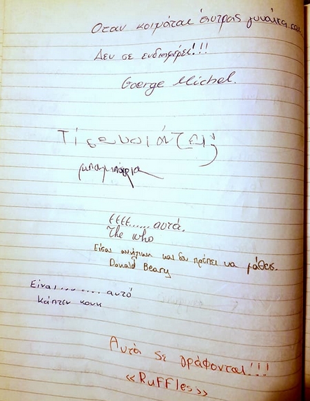 Κυριολεκτικά δεν πιστεύεις στα μάτια σου βλέποντας τι έγραφες ως μαθητής Δημοτικού. Βέβαια, οι «κολλημένοι» με την μπάλα υπέγραφαν στα nickname τους, ως Σαραβάκος, Αναστόπουλος ή Χένρικ Νίλσεν. Κάποιοι άλλοι ως Guns N' Roses και Bon Jovi, οι πιο ρομαντικοί ως Love, Romance, αλλά και το γεμάτο μυστήριο προσωνύμιο «Mr X».