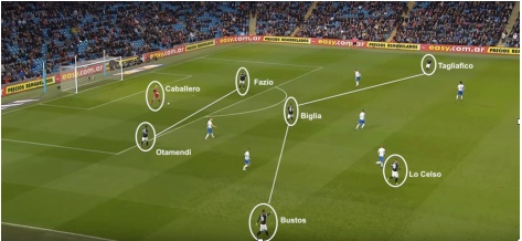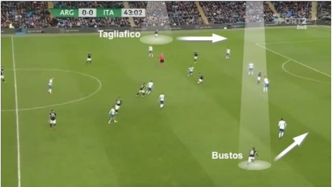 Η ιδέα του Σαμπάολι είναι το ένα τουλάχιστον μπακ να παραμένει πάντα ψηλά στο επιθετικό τρίτο της Αργεντινής η οποία ταυτόχρονα θα φέρει σύγκλιση προς τα μέσα σε πιο ελεύθερο ρόλο των τριών που θα αποτελούν την γραμμή πίσω από τους Μέσι κι έναν εκ των Ιγουαΐν και Αγουέρο. Με τον τρόπο αυτό θα προσπαθήσει να δημιουργήσει κενούς χώρους τους οποίους τα μπακ θα προσπαθήσουν να τα εκμεταλλευτούν. Και στο Μάντσεστερ το πλάνο δούλεψε καλά με το αριστερό μπακ-χαφ Ταλιαφίκο να φτάνει κοντά στο να σκοράρει με τον Μπουφόν να του λέει όχι.