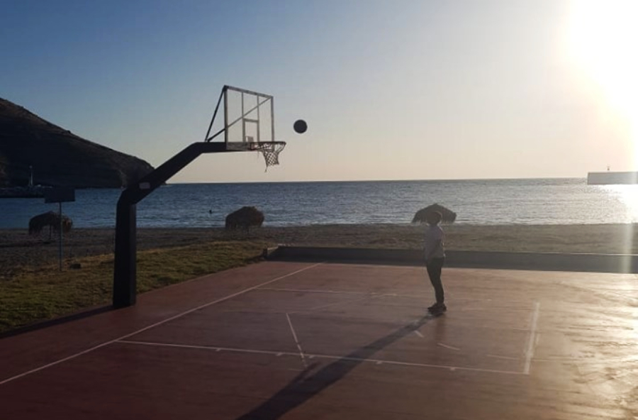 Στην παραλία κεντρικά του νησιού βρίσκεται κι ένα πανέμορφο γήπεδο μπάσκετ, στο οποίο μικροί και μεγάλοι επίσης μπορούν να παίζουν με την πορτοκαλί μπάλα τα ηλιοβασιλέματα, όταν πέφτει κι ο ήλιος και δεν υπάρχει τόση ζέστη. Το γειτονικό νησί της Λήμνου (απέχει δύο ώρες με το γρήγορο πλοίο και τρεις με το μικρό και ιστορικό «Αιολίς») μέχρι και φέτος είχε να χαίρεται την ομάδα του Ηφαίστου. Η Μαρία Κακαλή εκμυστηρεύεται πως «είχαμε σκεφτεί και είχαμε οργανώσει να έρθουν στο νησί κάποιοι παίκτες από την ομάδα του Ηφαίστου, αλλά δυστυχώς έτυχε ο κορονοϊός και ακυρώθηκαν όλα». Από την συναναστροφή, όμως, με τους αθλητές Α.Με.Α. Τυρταίος, των οποίων οι τρεις από τους τέσσερις αθλητές είναι και μέλη της Εθνικής Παραολυμπιακής Ομάδας, έμαθαν Μπότσια και Κορίνα, όπως προανέφερε, ενώ πληροφορήθηκαν πολύ σημαντικά πράγματα, όπως «μας είπαν και οι ίδιοι ποιες ανάγκες μπορεί να έχει το νησί, ώστε να είναι πιο φιλικό σε αμαξίδια, κάτι που είναι πολύ σημαντικό. Θέσαμε μια βάση, ώστε να φιλοξενήσουμε κι άλλες ομάδες στο νησί μας».