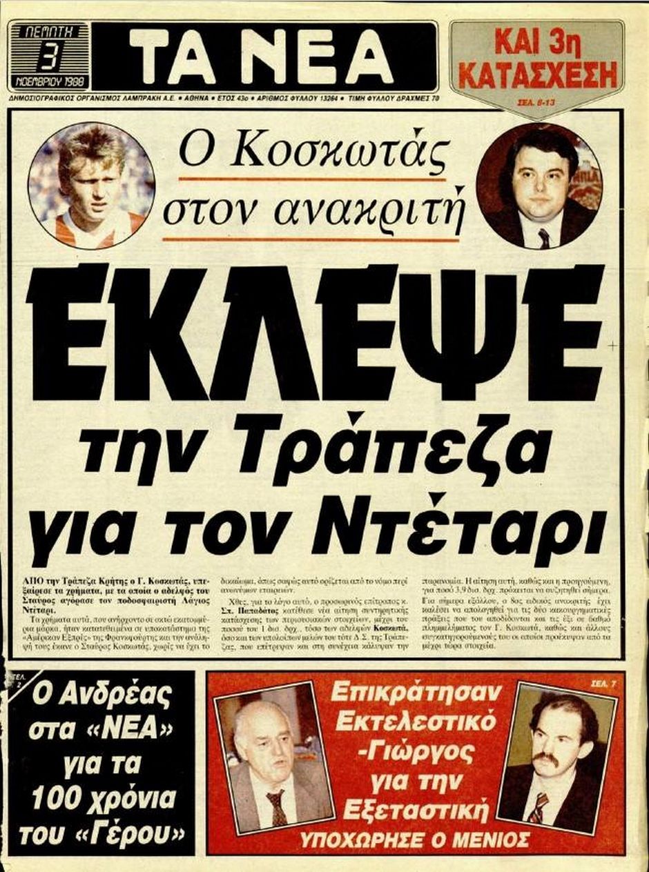 Η Ελλάδα αρχίζει να μαθαίνει τον όρο «διαπλοκή» και επί δύο χρόνια δημόσια τηλεόραση, ιδιωτικά κανάλια και εφημερίδες είχαν καθημερινή αναφορά στο σκάνδαλο Κοσκωτά. Ο τότε ιδιοκτήτης του Ολυμπιακού καταχράστηκε ανενόχλητος, μέσω δανείων από την Τράπεζα Κρήτης, 33,5 δισ. δραχμές από την Τράπεζα Κρήτης (που επιβάρυναν το Δημόσιο), χρηματοδοτώντας τον εκδοτικό του όμιλο, την ΠΑΕ Ολυμπιακός και κυρίως την τσέπη του.