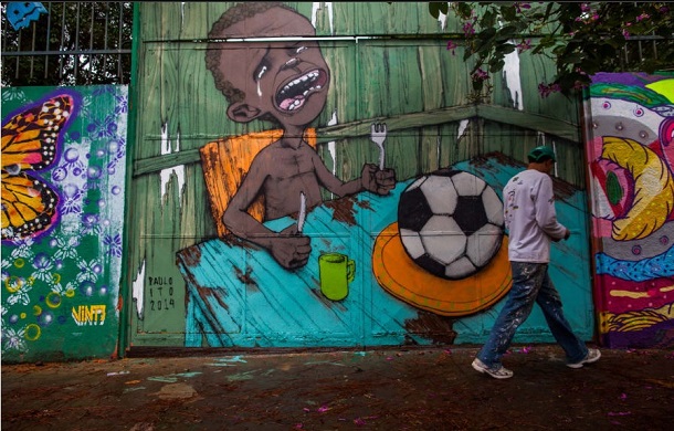 Αντί επίλογου, το πιο αντί – ποδοσφαιρικό και, ταυτόχρονα, συγκλονιστικό γκράφιτι που σημάδεψε το Παγκόσμιο Κύπελλο του 2014. Η Βραζιλία, μια χώρα με αμέτρητους φυσικούς πόρους, αλλά και τεράστια φτώχεια, ξόδεψε περί τα 7 δισεκατομμύρια ευρώ για να διοργανώσει το Μουντιάλ.